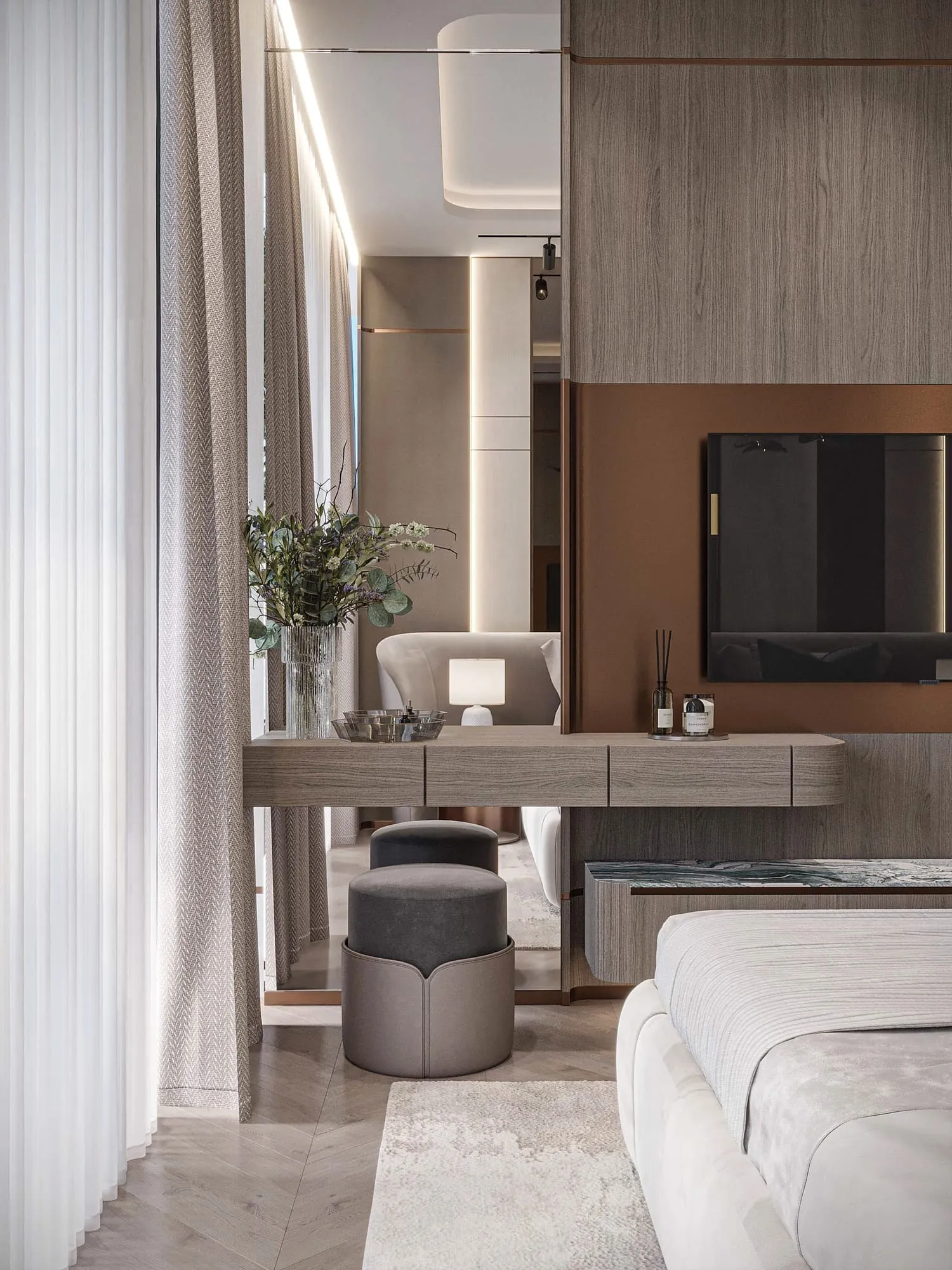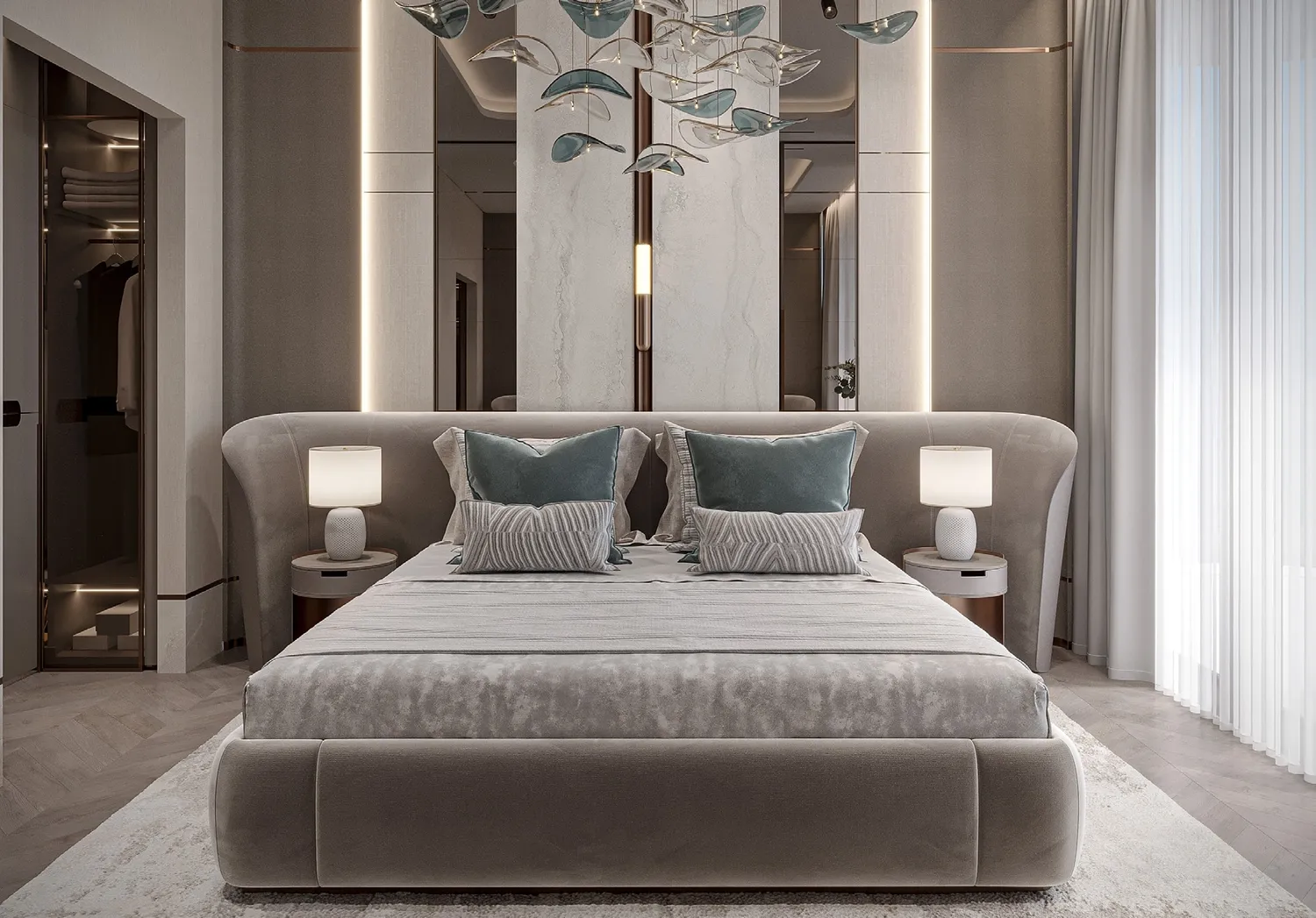 The interiors of 241 Waterside are shaped by a premium material palette that emphasizes natural textures and luxury craftsmanship. Finishes include high-quality stone surfaces, refined wall treatments, and elegant color tones that create a calm and modern atmosphere. Kitchens and household appliances feature Miele and Smeg, providing reliable performance and a high-end user experience. Bathroom fittings and hardware come from Gessi, combining precision engineering with timeless minimalist design. Homes include Orvibo smart home automation for lighting, climate, and security controls, ensuring modern convenience integrated seamlessly into the living space.