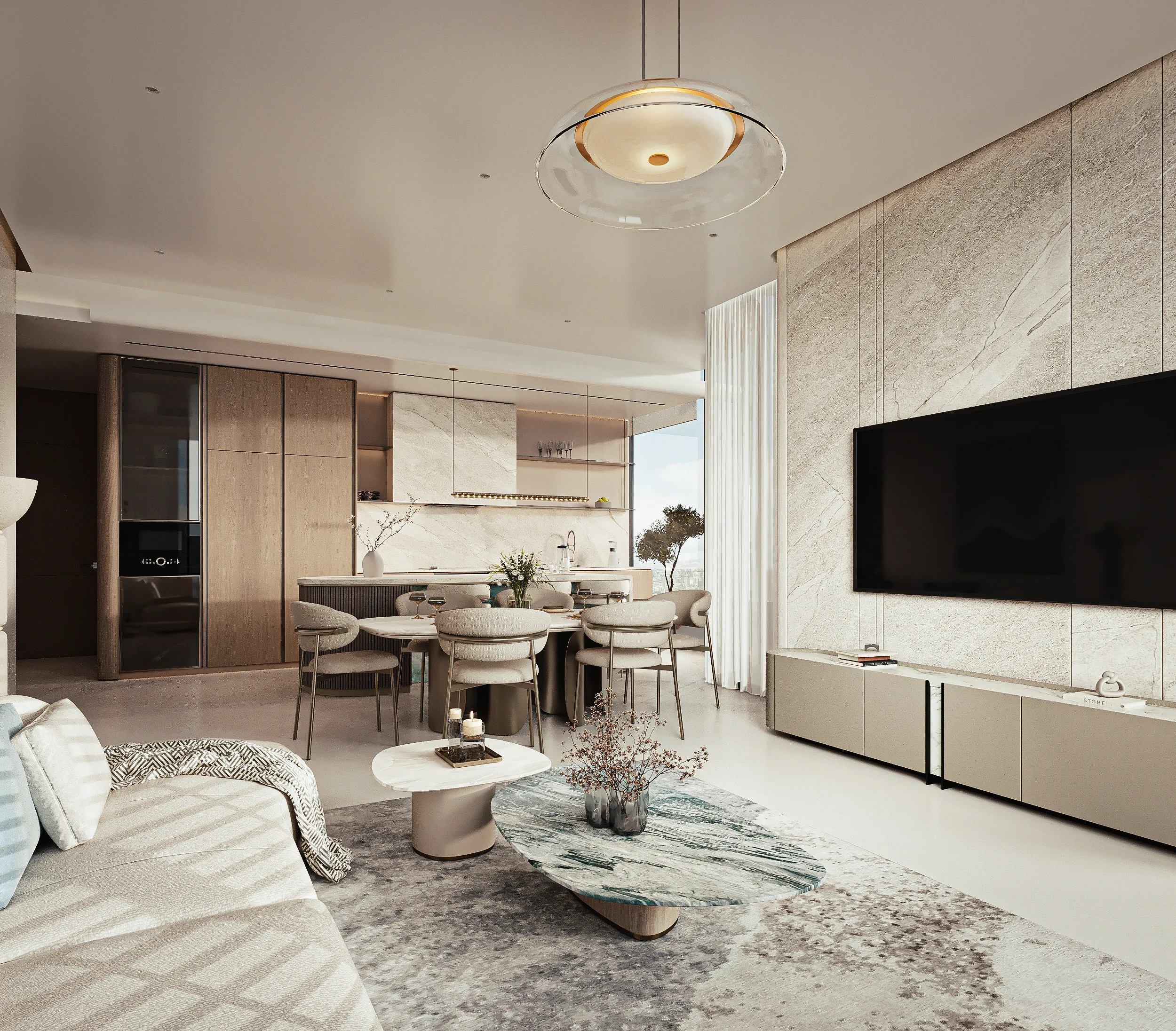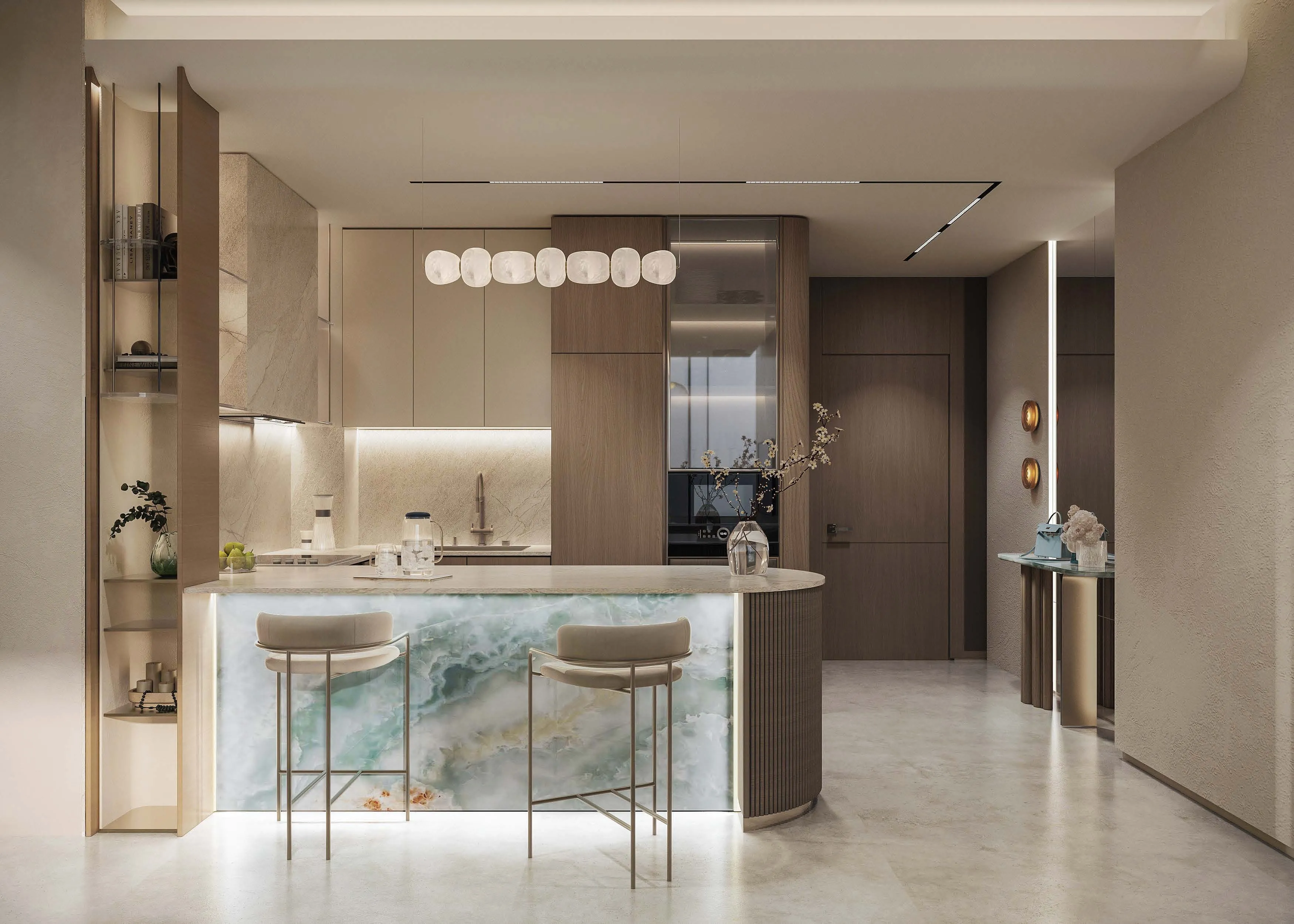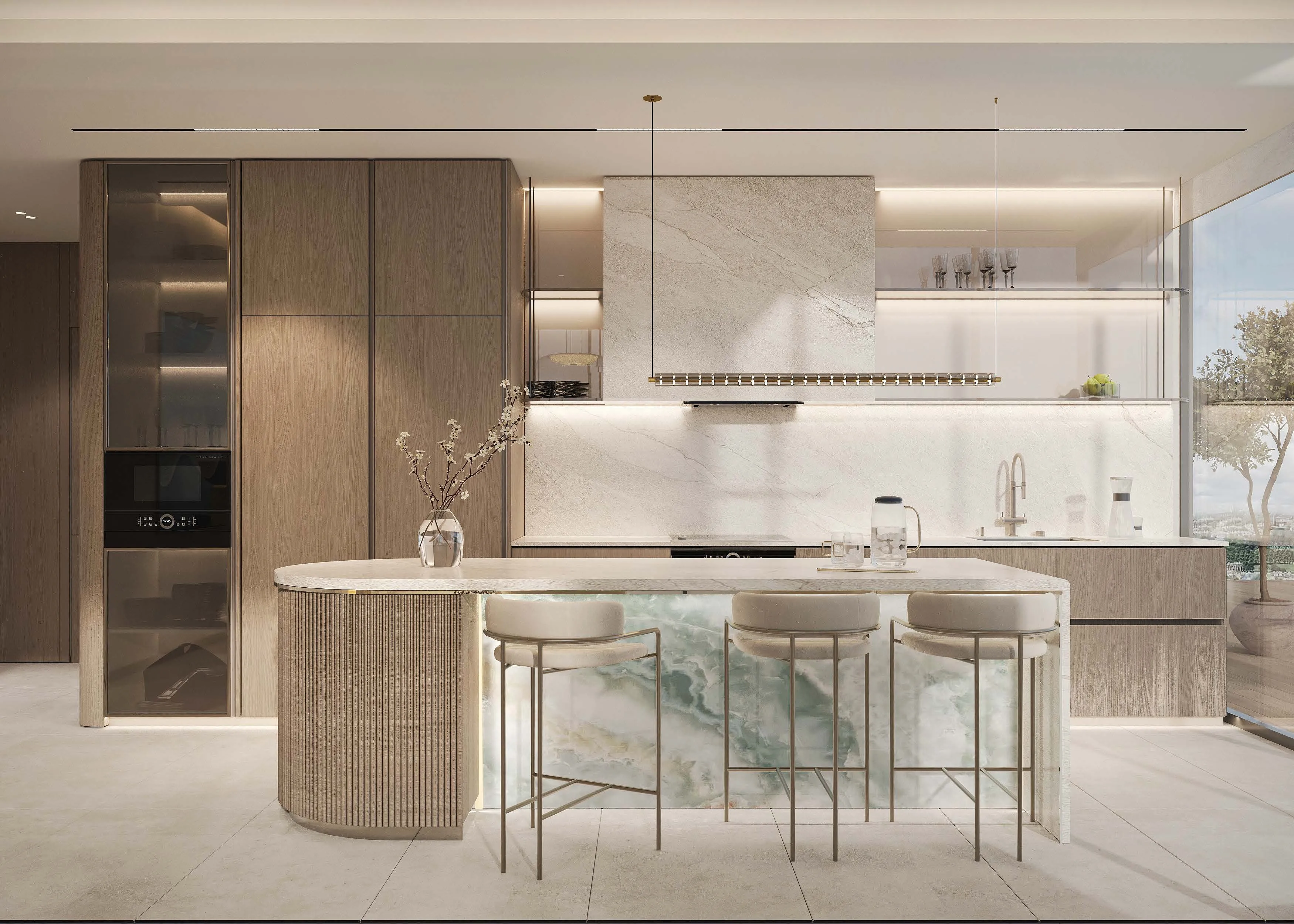 The apartments are finished with premium materials and high-quality details that reflect refined taste and lasting value. Kitchens are modern and elegant, designed with sleek cabinetry, quality surfaces, and functional layouts that blend seamlessly with living and dining areas. From natural stone touches to warm wood accents and refined finishes throughout, every home feels sophisticated, welcoming, and crafted to the highest standard.