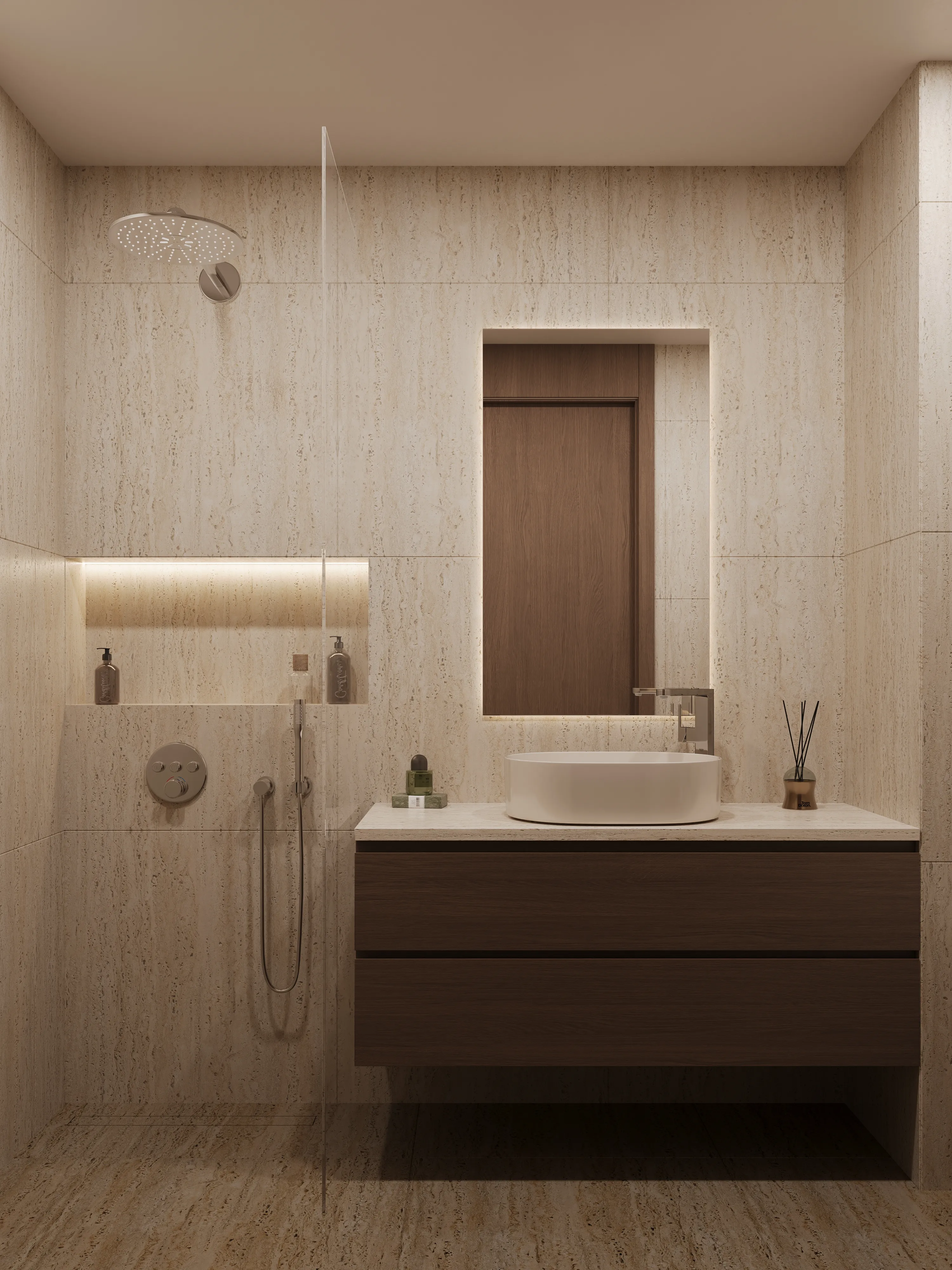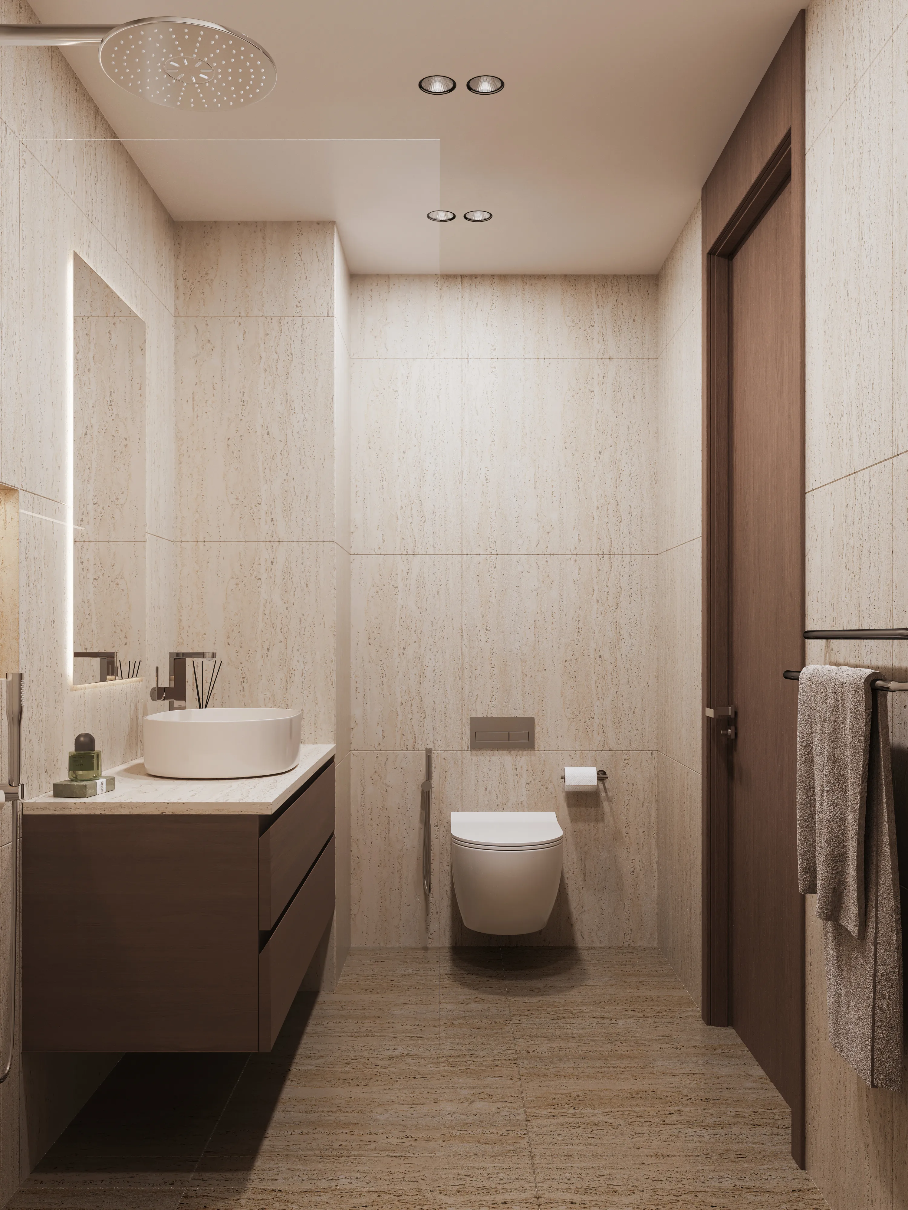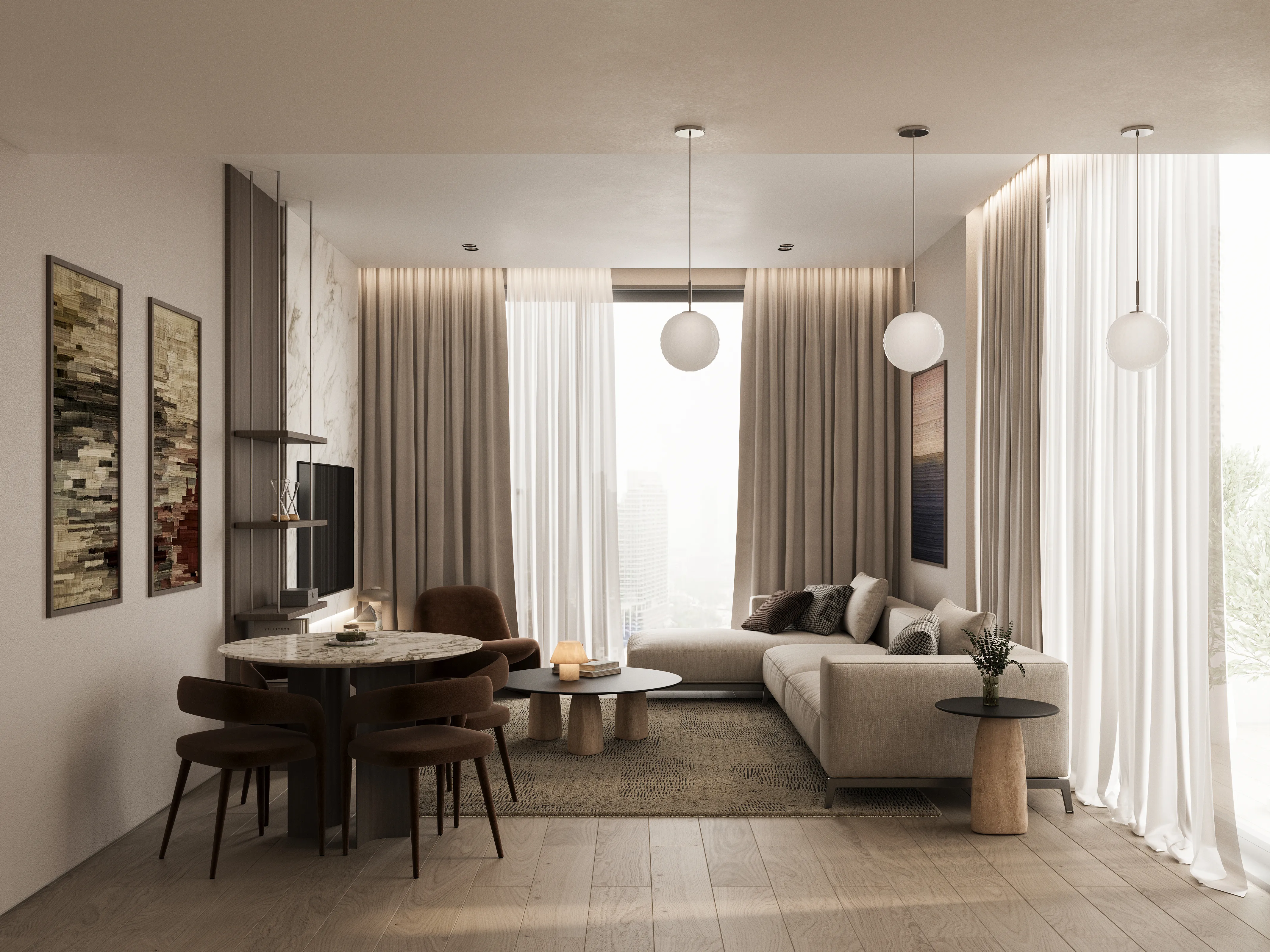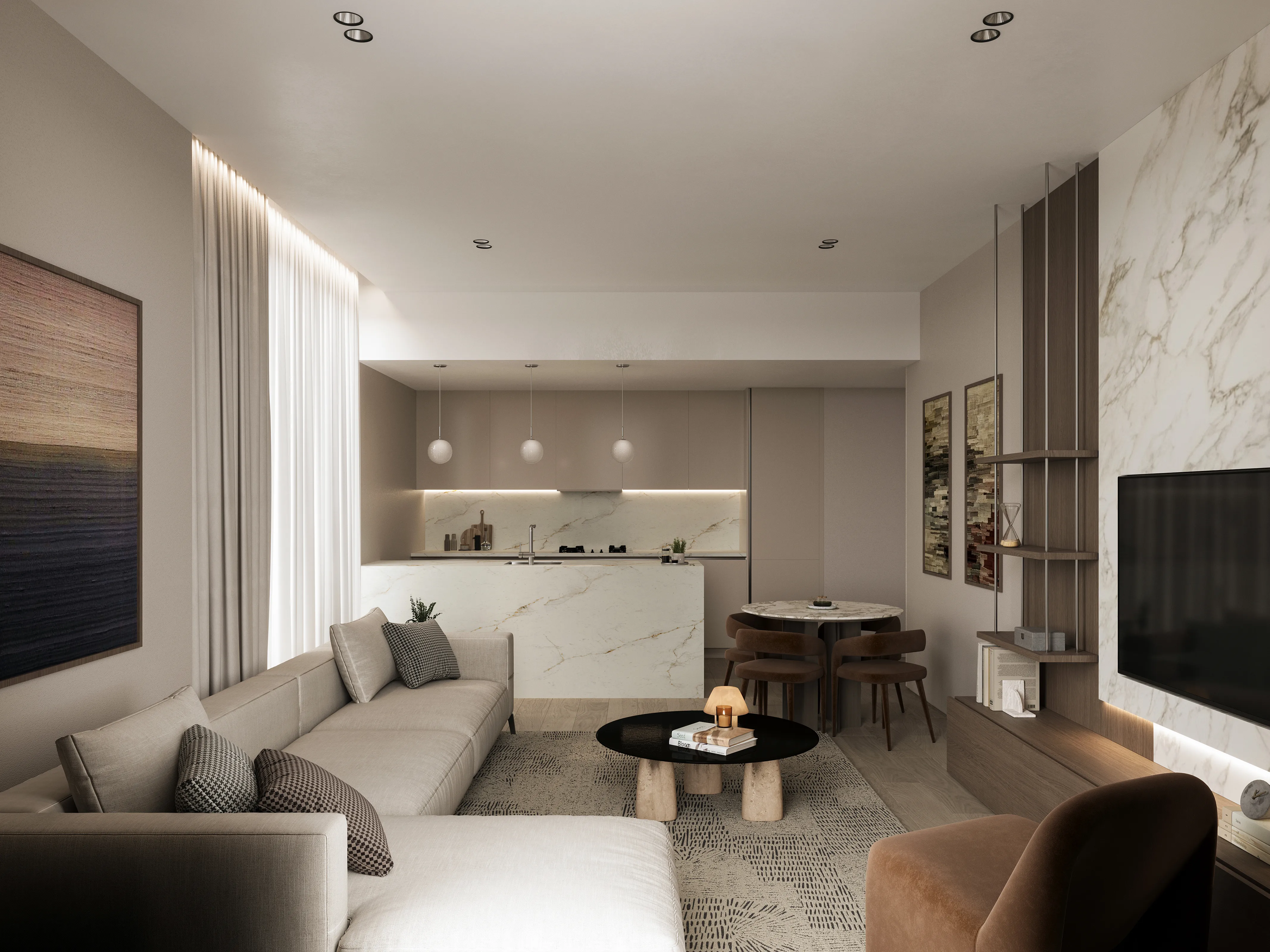 Interiors feature modern finishes executed with high-quality materials, creating a clean and timeless aesthetic throughout the living spaces. Kitchens are fully equipped, designed to complement the contemporary character of the residences with practical layouts and integrated appliances. The apartments are delivered semi-furnished, allowing residents to move into a refined, well-prepared home while retaining flexibility for personal customization.